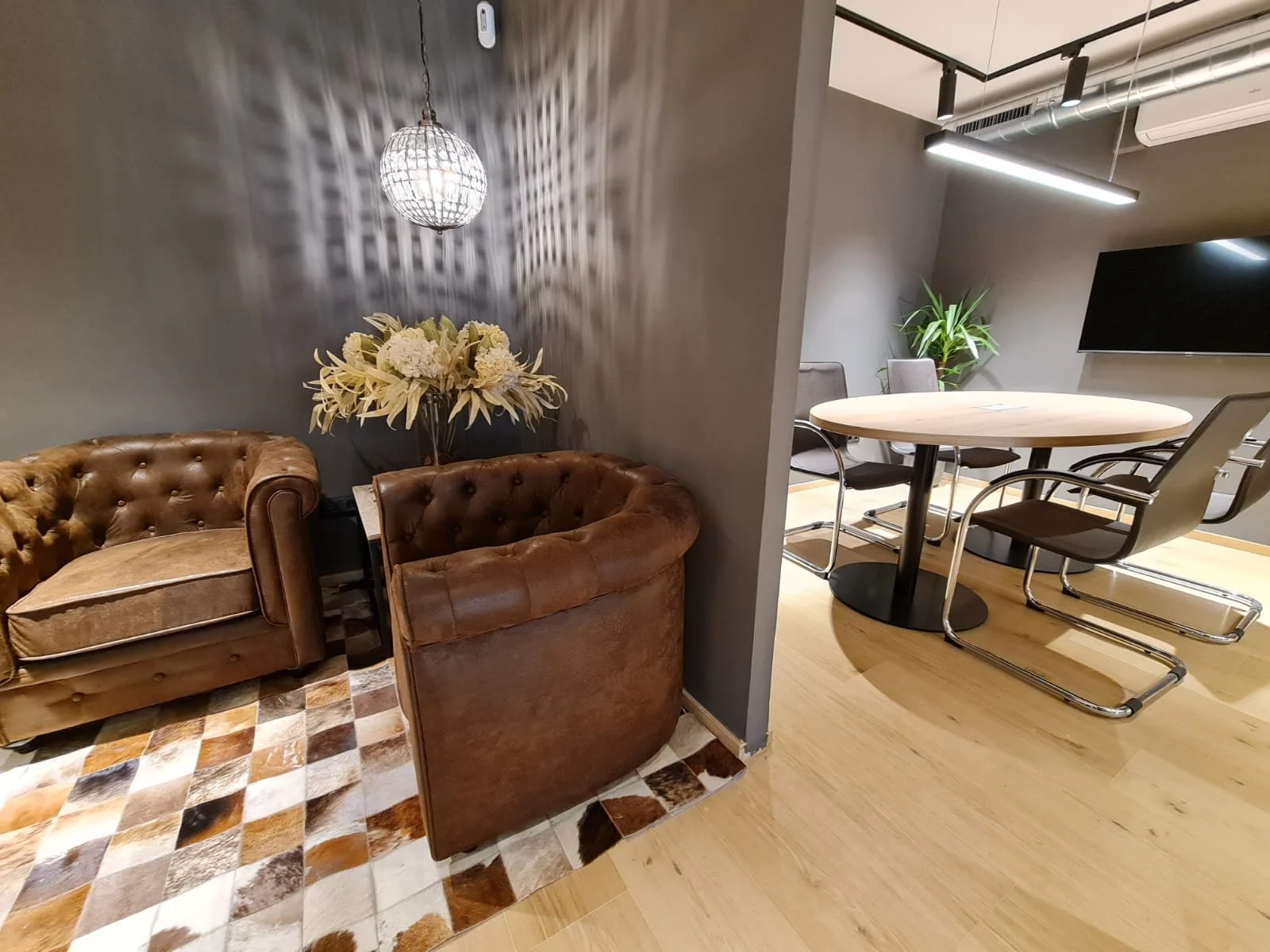 Espacio equipado para encuentros profesionales con total privacidad. Incluye mesa de reuniones, 4 sillas, enchufes, cortinas para mayor intimidad, aire acondicionado y televisión para videollamadas o presentaciones.